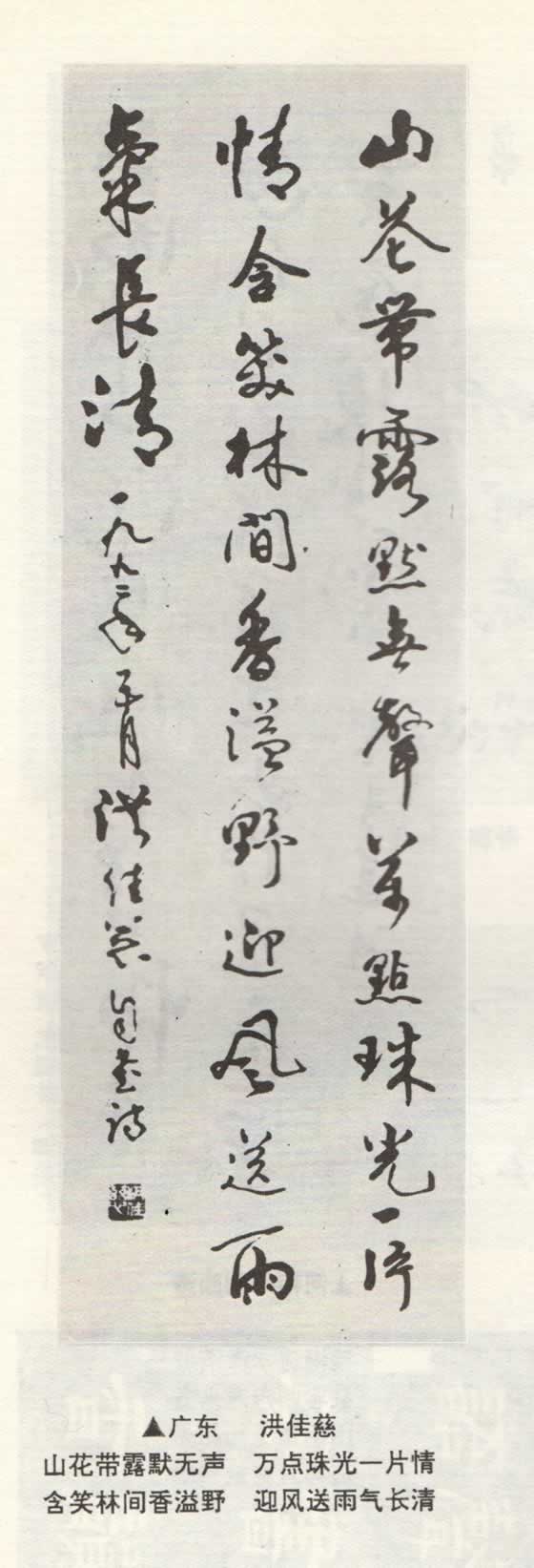 洪佳慈作品展 一、洪佳慈发表在《书法艺术》杂志上的书法作品 洪佳慈老师工作和生活的那个年代,没有互联网,因而在互联网上保存的资料极其有限,幸运地发现,在一九九二年第四期《书法艺术》杂志上刊登了洪佳慈老师的作品,立即将此书购回,在此分享给大家,也作为对洪佳慈老师的怀念。